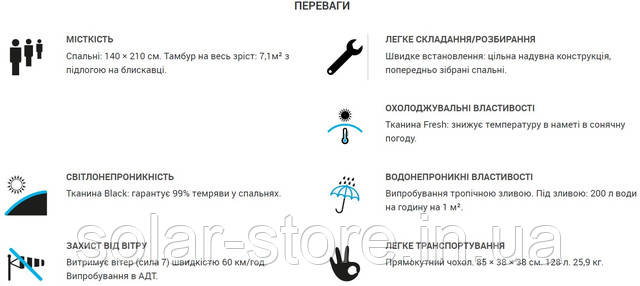 | Особливості намету/тенту | Антимоскітна сітка, Проклеєні шви, Навіс, Тамбур, Вентиляційні вікна, Вітрозахисна/снігозахисна спідниця, Внутрішні кишені, Водовідштовхувальне просочення, Захист від UV, Штормові відтяжки, Кріплення для ліхтаря |